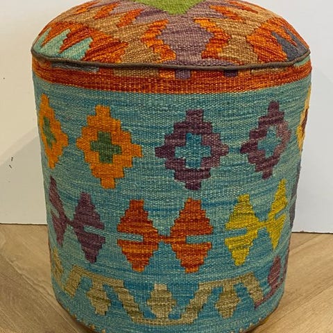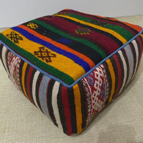 Denne autentiske puf / stol / bænk er lavet af 100% håndvævet Kelim, og benene er af træ. Meget ideel til din stue, soveværelse eller køkken.