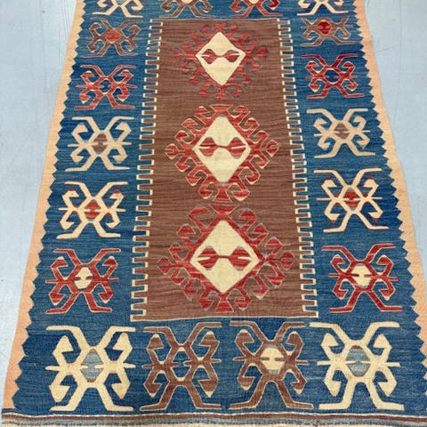Eksklusiv antik stamme-kelim fra Konya, i hjertet af Anatolien, Tyrkiet. Vævet udelukkende i hånden med 100% naturlig uld, repræsenterer dette stykke den nomadiske og stammemæssige tradition i den centralanatolske region, kendt verden over for sine kelimer af stor kulturel og æstetisk værdi.