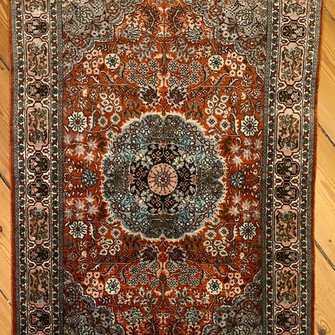 Oprindelsesland: Kina; Model: Pure Luxury & Great Decor Art; tæppe af silk on silk, 158 cm x 104 cm, i meget god stand og professionelt renset. Klik på den blå "gå til varen" knap, for at købe eller byde på denne vare. Den samlede pris vil blive vist inden du afgiver dit bud.