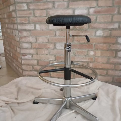 Det er en gammel værktøjskstol med en synlig skruemekanisme, der muliggør individuel justering af sædets højde.