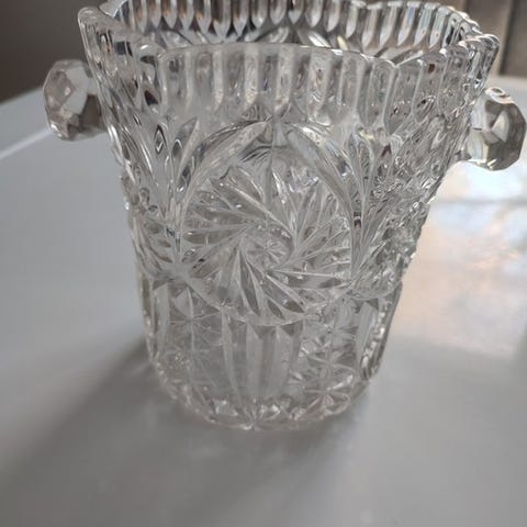 Meget god stand, ca. 90 år, skåret krystal, familiearvestykke, bryllupsgave fra mine forældre, højde 14 cm og bredde inklusive håndtag 17 cl.