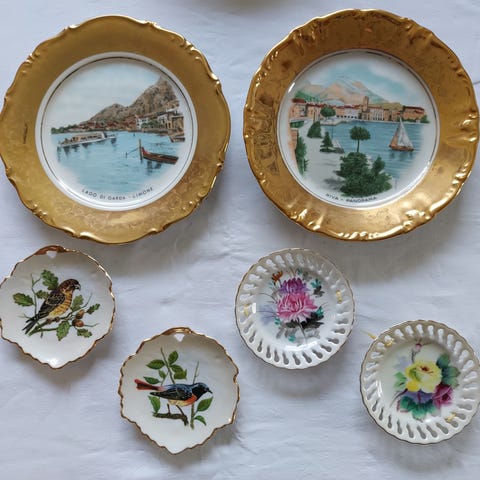 2 smukke vintage platter/tallerkner med guldskrift, sælges for 60 kr.