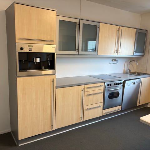Miele indbygningskøkken med hvidevarer bestående af opvaskemaskine, køleskab, ovn og kaffemaskine. Køkkenet har hvide fronter og bordplade, samt integrerede hvidevarer i rustfrit stål og sort. Designet til funktionelt køkkenbrug med opbevaringsskuffer og skabe.