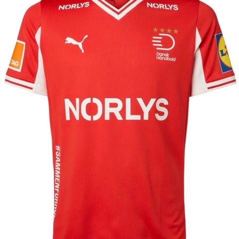 Puma Danmark VM Guld 2023 T-shirt i rød farve, størrelse 164. T-shirten har guldtryk med teksten 'VM GULD 2023' og logoer fra Norlys og DBU. Fremstillet i let materiale, egnet til børn i størrelsen 164.
