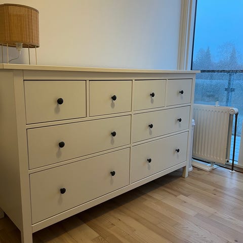 Sælger denne skønne ikea kommode. Den er lidt slidt på top pladen og den nederste skuffe til højre køre lidt trægt. Men ellers er den en fin, men brugt kommode med brugspor. Derfor den skarpe pris