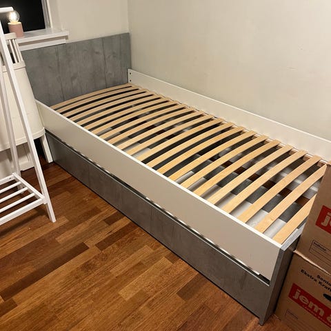 IKEA seng med opbevaringsskuffer i sort og hvid