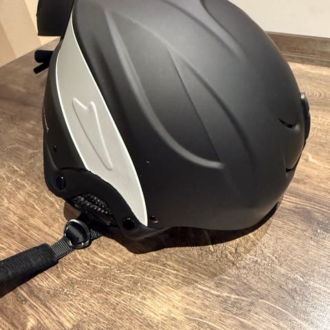 skihjelm i mat sort farve. Hjelmen har ventilation og justerbar rem under hagen og den kan justeres i nakken. Indvendigt foret med polstret materiale for komfort og beskyttelse. Egnet til skibrug for børn. Den er brugt på 1 skitur. Overfladiske ridser uden betydning (se billeder) fremstår rigtig fint. Der er strop bagpå til skibriller