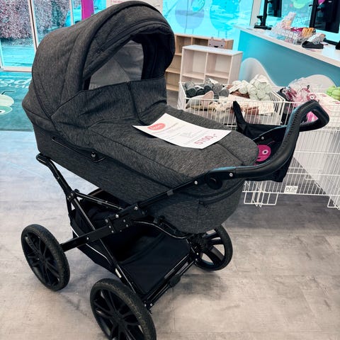 Odder barnevogn i grå farve. Barnevognen har stor kaleche, robust stel og store hjul, som egner sig til forskellige underlag. Designet til at give god komfort og sikkerhed for barnet.