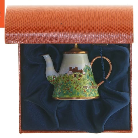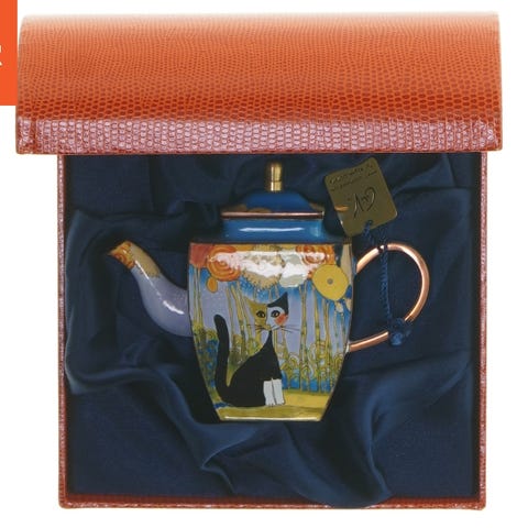 Dette er en lille miniature tekande med et farverigt design med havheste og måner, skabt af Charlotte di Vita. Tekanden har en overvejende blå farve og er udsmykket med røde og gule detaljer. Den kommer i en udstilling boks med et blåt stofinteriør og orange yderkant. Limited edition produceret i London.