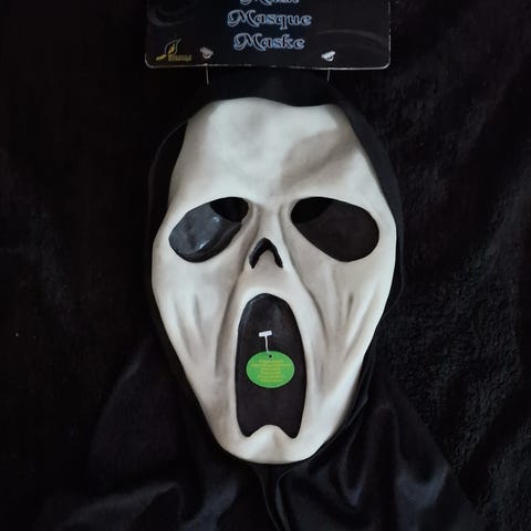 Dette er en Vendetta maske, også kendt som Guy Fawkes maske, lavet af plastik. Masken har et hvidt ansigt med sorte streger, der danner øjenbryn, overskæg og goatee. Den har røde kinder og er udstyret med elastik til fastgørelse om hovedet. Maskens størrelse er 19x19 cm og bruges ofte til kostumer eller demonstrationer.