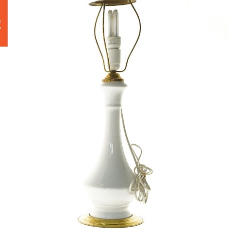 Denne vare er en bordlampe lavet af messing. Lampen har en rund base og en slank, cylindrisk stander med en lampefatning på toppen. Den er designet med en hvid ledning og stik, der kan ses viklet omkring standeren. Lampens højde er 43,5 cm. Den mangler en lampeskærm.