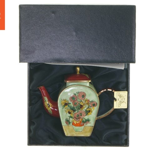 Denne keramiske tekande viser en imponerende og farverig dekoration, inspireret af Gustav Klimts kunstværker. Den har unikke geometriske mønstre og symboler i en række guld, grønne og brunlige nuancer. Tekanden er pakket i en flot sort opbevaringskasse med satinforing, som giver et elegant udtryk. Kassen inkluderer et certifikat, der garanterer autenticiteten af designet, fra Teatime Treasures. Tekanden har dimensionerne 8,5x13 cm.