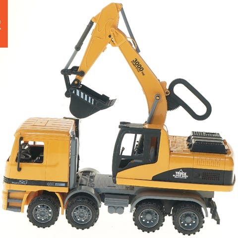 30 cm legetøjslastbil med en bevægelig kranarm og krog. Lastbilen er i en lys gul farve med sorte hjul og dekorationer. Den har flere klistermærker med ordet 'Caution' og 'Special Truck', hvilket giver den et autentisk udseende som en byggeplads lastbil. Kranarmen kan hæves og sænkes, og bilen er detaljeret med rigtige vinduer og paneler.