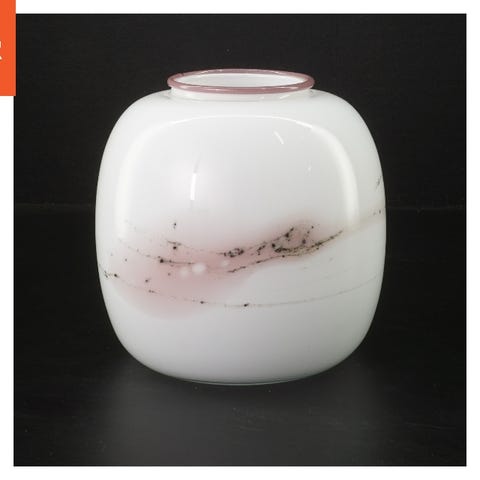Denne vase er fremstillet af glas og har en oval form med en højde på 16 cm. Vasen er primært hvid og er dekoreret med smukke, farverige mønstre i nuancer af lilla og sorte på den ene side, hvilket giver den et unikt og kunstnerisk udseende. Den anden side er helt hvid uden mønstre. Åbningen på vasen er bred nok til at rumme en lille buket blomster eller som dekoration alene.