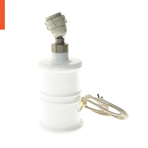 Dette er en hvid bordlampe fra Royal Copenhagen med en højde på 40 cm. Lampen har en glat keramisk overflade og en enkel, elegant form. Den leveres med ledning og stik til tilslutning. Lampen er velegnet til indendørs brug og kan tilføje et klassisk touch til ethvert rum. Bagsiden af lampen viser produktdetaljer og logo.