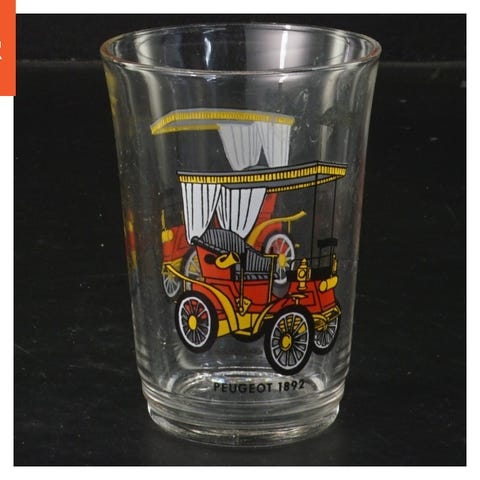 Et sæt af fire lange glas med Puch-logo trykt på forsiden. Glassene har en diameter på 6,5 cm og er 13 cm høje. De ikoniske Puch-køretøjer er også trykt som dekorationer på glassene, hvilket gør dem perfekte til motorcykel- eller cykelentusiaster.