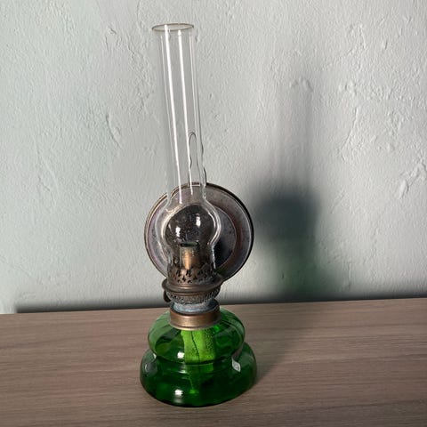 Denne antikke petroleumslampe har en glasbase og en lang, klar glas-skorsten. Den har en messingbeslag til vægen og en sort base, der understøtter lampen. Lampen måler 53 cm i højden og er velegnet til både dekorative og funktionelle formål.
