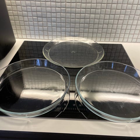 Set af gennemsigtige glasfade, til forskellige anledninger. Diameteren af fadene er 20 cm. De er passende til servering af mad eller som dekorative elementer i hjemmet. Der er ingen synlige mærker eller logoer på fadene.