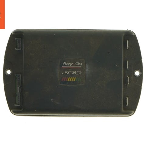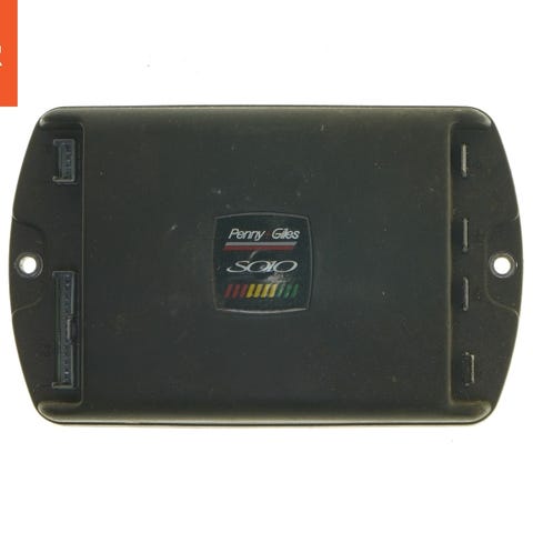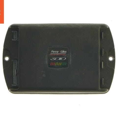 En sort Solo motorstyringsenhed fra Penny & Giles med dimensionerne 18x11,5 cm. Enheden har stik og terminaler synlige på siderne til tilslutning. Den har et mærke/logo på overfladen. Den bruges til at regulere motorpræstationer og kan være en del af et større motorstyringssystem.