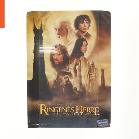 Denne plakat er fra filmen 'Ringnes Herre: De To Tårne'. Plakaten måler 50x70 cm og viser flere karakterer fra filmen samt et gråt tårn i baggrunden. Den er trykt i nuancer af brunt og orange med tydelig titel skrift for neden. Plakaten blev distribueret af Blockbuster og viser filmens ikoniske motiv. Den kommer rullet op, som illustreret på billederne.