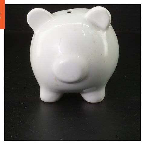 Denne genstand er en keramik sparegris, formet som en gris. Den er primært hvid med orange detaljer, som øjne og ører. Øverst på grisen er der en møntslids, hvor man kan indsætte penge. Den er 15 cm lang, 12 cm bred og 11 cm høj.