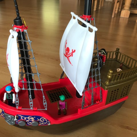 Et fantasifuldt pirat skib legetøj designet med detaljer som en mast med et pirat flag, en rød skibshynde og forskellige legetøjsdetaljer omkring skibet. Det er lavet af plast og har hjul i bunden, hvilket gør det nemt for børn at lege med. Skibet er også udsmykket med elementer som et anker og udsigtstårn.