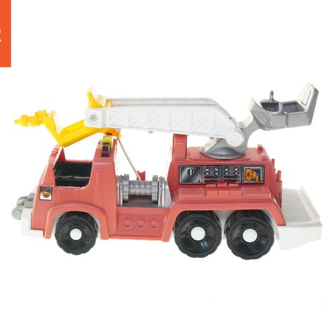 Legetøjsbrandbil fremstillet i plast. Den har en livagtig udformning med detaljer som stiger og lys på toppen. Brandbilen har seks hjul og er overvejende rød med enkelte gule og grå elementer. Den indeholder også en figur i førerkabinen og har dimensionerne 30x11x13 cm.