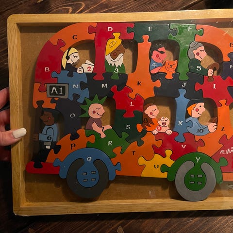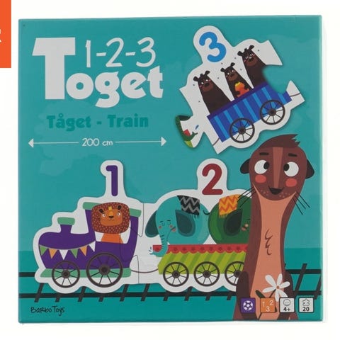 Dette er et farverigt puslespil kendt som '1-2-3 Tog', som indeholder dele illustreret med tal og dyr. Billedet viser, at spillet består af dele, der tilsammen danner et tog, der er 200 cm langt, når det er samlet. Det er ideelt for børn til at lære tal og dyr gennem leg. Puslespillet kommer i en æske med størrelsen 21x21 cm og indeholder flere nummererede togvogne med forskellige dyremotiver. Tags: puslespil, tog, legetøj, børn, læring, dyr