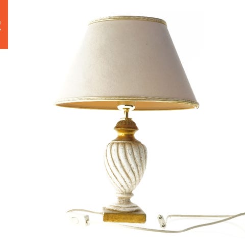 Dette er en antik bordlampe med en unik porcelænsbase. Basen er dekoreret med figurer af to engle, der står omkring lampens søjle. Lampen har en klassisk lampesokkel af messing med en ledning og stik. Størrelsen på lampen er 54 cm i højden. Den elektriske ledning ser ud til at være i brugbar stand.