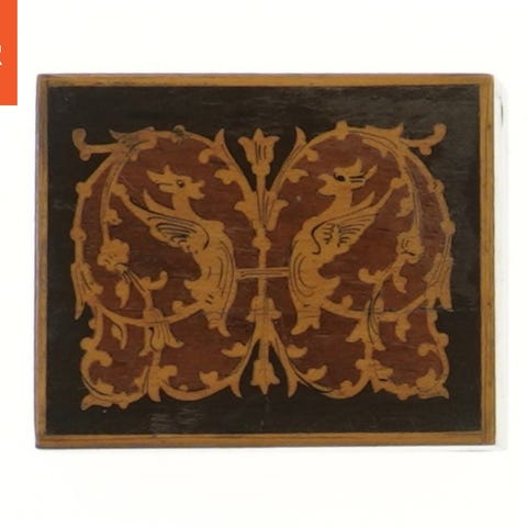 Æske af træ med håndmalede blomsterdekorationer på låget og siderne. Æsken har en indvendig plads til opbevaring, og kan åbnes via et metalhængsel. Farven er overvejende gul med enkelte grønne, røde og blå detaljer. Størrelsen er 31,5x19x9 cm.