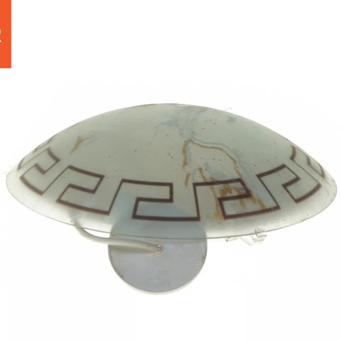 Rund glasplade med diameter på 31,5 cm, beregnet til brug som del af en loftlampe. Glaspladen har et dekorativt mønster rundt i kanten og viser tegn på nogle brune pletter, der kan være skidt eller patina. Lampen omfatter ledninger og monteringsflade i metal til tilslutning til loft. Tags: glasplade, loftlampe.