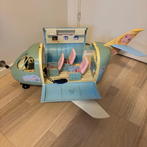 Dette er et Barbie legetøjsfly, der primært er lyserødt med hvide accenter. Flyet har Barbie-branding og typiske Barbie-stylingelementer. Det har detaljer som roterende propeller og små hjul under flyet, som gør det nemt at skubbe og manøvrere. Dette fly er designet til at ligne et lille privatfly og har plads til Barbie-dukker inde i kabinen. Det måler 75 cm i længden.