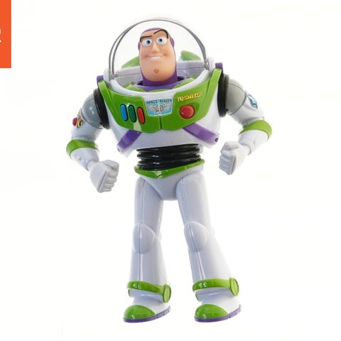 Denne actionfigur forestiller karakteren Buzz Lightyear fra filmen 'Toy Story'. Figuren er 32 cm høj, med et farveskema bestående af primært hvid, grøn og lilla. Buzz har en detaljeret rumdragt med en gennemsigtig hjelm, karakteristiske logoer og kontrolpaneler på brystet. Figuren er veludformet og har robuste arme og ben, som giver den mulighed for at stå oprejst og posere. Detaljeringen på både front og bagside fanger essensen af den ikoniske karakter.