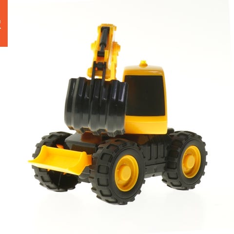 Dette er en legetøjsgravemaskine lavet af plastik, med en primær farve i orange og sorte detaljer. Den har fire hjul og en bevægelig arm med en gribeklo. Den er designet til at ligne en realistisk gravemaskine, hvilket gør den ideel til børns leg. Størrelsen på gravemaskinen er 51 cm i længden.