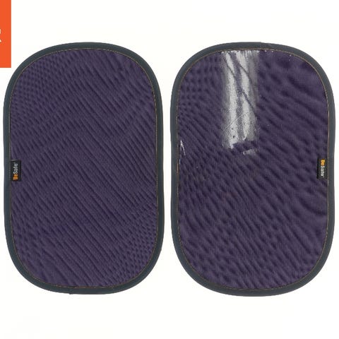 Et sæt bilsæde solskærme, der er designet til at beskytte mod sollys i bilen. De er lilla i farven og kantet med sort. Med en størrelse på 48,5 x 31 cm, passer de til bilers vinduer for at reducere solens glar. De har BeSafe logo på dem, hvilket antyder, at de er fra mærket BeSafe.