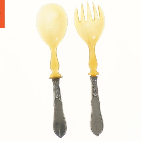 Dette bestiksæt består af seks dele: tre gafler med brun håndtag og tre skeer i sølv. Gaflerne har et elegant design med todelte tænder og sølvdetaljer. Skeerne har et klassisk stil med en buet form og glansfuld finish.