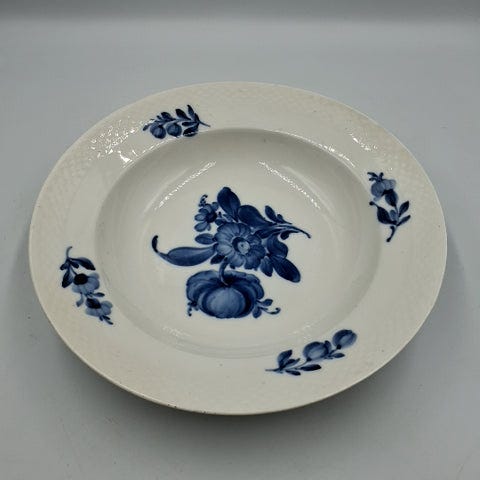 Dette er en firkantet blå tallerken med et dekorativt fuglemotiv. Detaljeret dekorationen viser en fugl omgivet af frodige blade og blomster. Tallerkenen er lavet af keramik og har en blank overflade. Den er udstyret med en metalholder på bagsiden, som giver mulighed for at hænge den op som dekoration. Størrelsen på tallerkenen er Ø 22,5 cm.