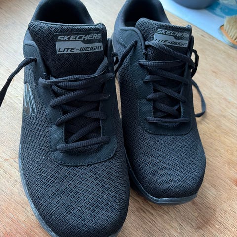 Et par sorte Skechers FlexSole sneakers i størrelse 47,5. Skoene har en slip-resistent sål og er designet med Relaxed Fit teknologi for ekstra komfort. Overdelen er lavet af åndbart mesh-materiale, og skoene har snørebånd til lukning. Indvendigt er der en polstret indlægssål for øget støtte og komfort. Tags: sneakers, sko, sportssko