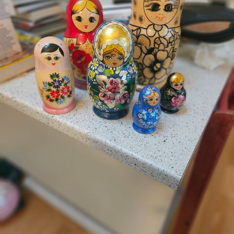 Dette er et sæt traditionelle russiske matroska dukker. Dukkerne er malet i en mørkeblå farve med blomstermotiver. Hver dukke er hult indeni, så de kan placeres inden i hinanden, fra den største til den mindste. De varierer i størrelse fra cirka 4 cm til 15 cm. Den største dukke fungerer som en beholder for de andre mindre dukker, som alle er smukt håndmalede med detaljer som blomster og dekorationer.