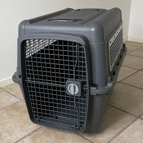 Camo Sammenklappelig Transportboks fra Zooplus i brun og grå farve med netvinduer på flere sider. Buret har en lomme på siden til opbevaring.