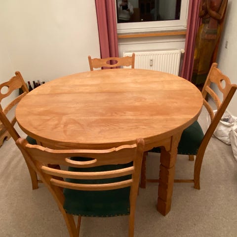 Det runde bord skaber en indbydende og social spiseplads, hvor alle sidder i naturlig kontakt – ideelt til både hverdagsbrug og hyggelige middage. Sættet fremstår i næsten ny stand og er et oplagt valg til den kvalitetsbevidste bolig.