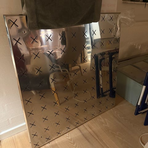 Kæmpe opslagstavle af hvidmalet akustikplade, indrammet med hvid aluramme (ca. 270 x 110 cm) Der er udskåret lille hul 12x12 cm. til TV-ophæng. Nærbillede pladen så kan ses den malede overflade. Skal afhentes i Allerød.