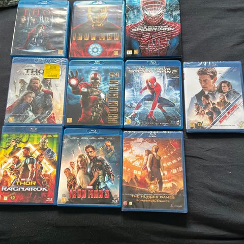 Samling af Marvel Blu-ray film med forskellige titler og karakterer. Indeholder film som Thor, Spider-Man, Avengers og flere andre. Egnet til fans af superhelte og actionfilm.