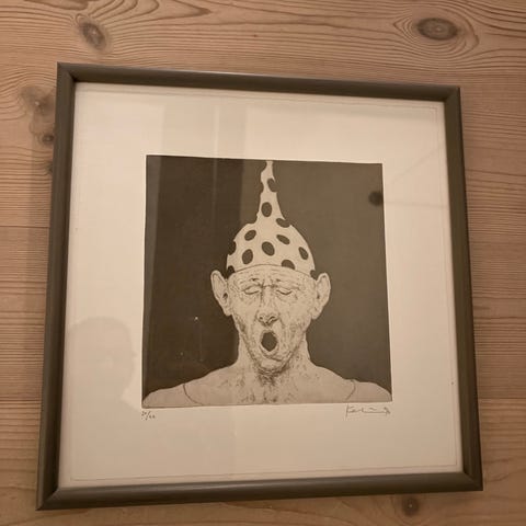 Michael Kvium - Alien Aftermath skitse fra cirkus Europa udstillet på Arken, er indrammet med museumsglas, måler 38,5 x 38,5 cm