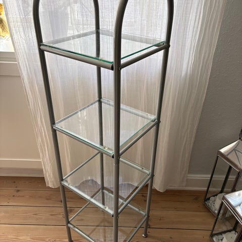 vægreol i rund form, lavet af metal. Reolen har flere rum til opbevaring og kan bruges til at organisere og fremvise forskellige genstande på væggen.