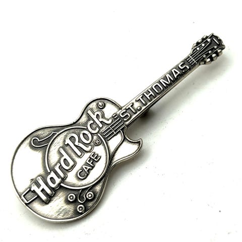 Pin eller broche fra legendarisk café i helt perfekt stand. Det er en Gibson Les Paul Black guitar. Ingen skader på emalje eller bagside. Nålen er fin og lige og lukketøjet virker, som det var nyt. Den er 6 cm lang. Bemærk også at bagsiden er præget med Hard Rock Café!