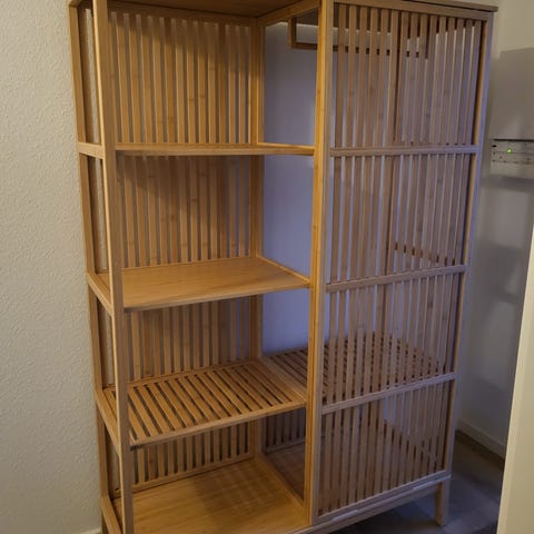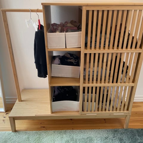 Fint garderobe fra Nordkisa serien fra Ikea. Det er i fint stand og let i udtrykket. Se evt modellen på Ikea hjemmeside. Nypris 1.300kr. Jeg gør opmærksom på at skruen på toppen af bøjlestangen ikke kan spændes ordentligt fast, men er uden betydning når tøjet der bliver hængt der, holder det stabilt. Måske en bedre skrue er løsningen - vi har ikke forsøgt eller har haft behov for det :-). Skal hentes på indre Østerbro.