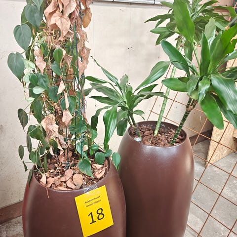 Krukker med planter 2 stk. Krukkerne er i brunt plast og måler 83 h x Ø 40. Planterne er ikke garanteret i live ved udlevering. Brugte og med brugsspor