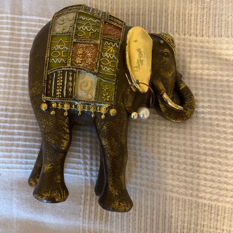 Keramik elefant figur i blå og hvid farve med dekorative mønstre. Figuren har en firkantet top, der kan anvendes som lille bord eller stander. Egnet til dekoration i hjemmet eller haven.
