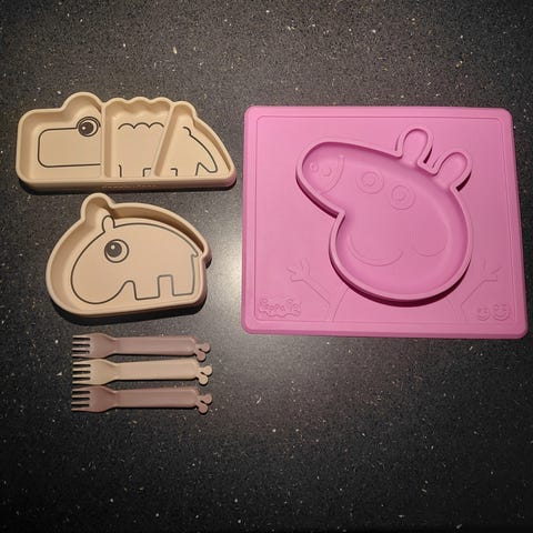 Sæt bestående af en børnekop med tud og to skeer, alle fremstillet af fødevaregodkendt silikone. Koppen har to håndtag for nem håndtering af små hænder og en dimension på 11,5 cm i højden. Skeerne er 16 cm lange. Designet er praktisk og ideelt til små børn, der lærer at spise selv.